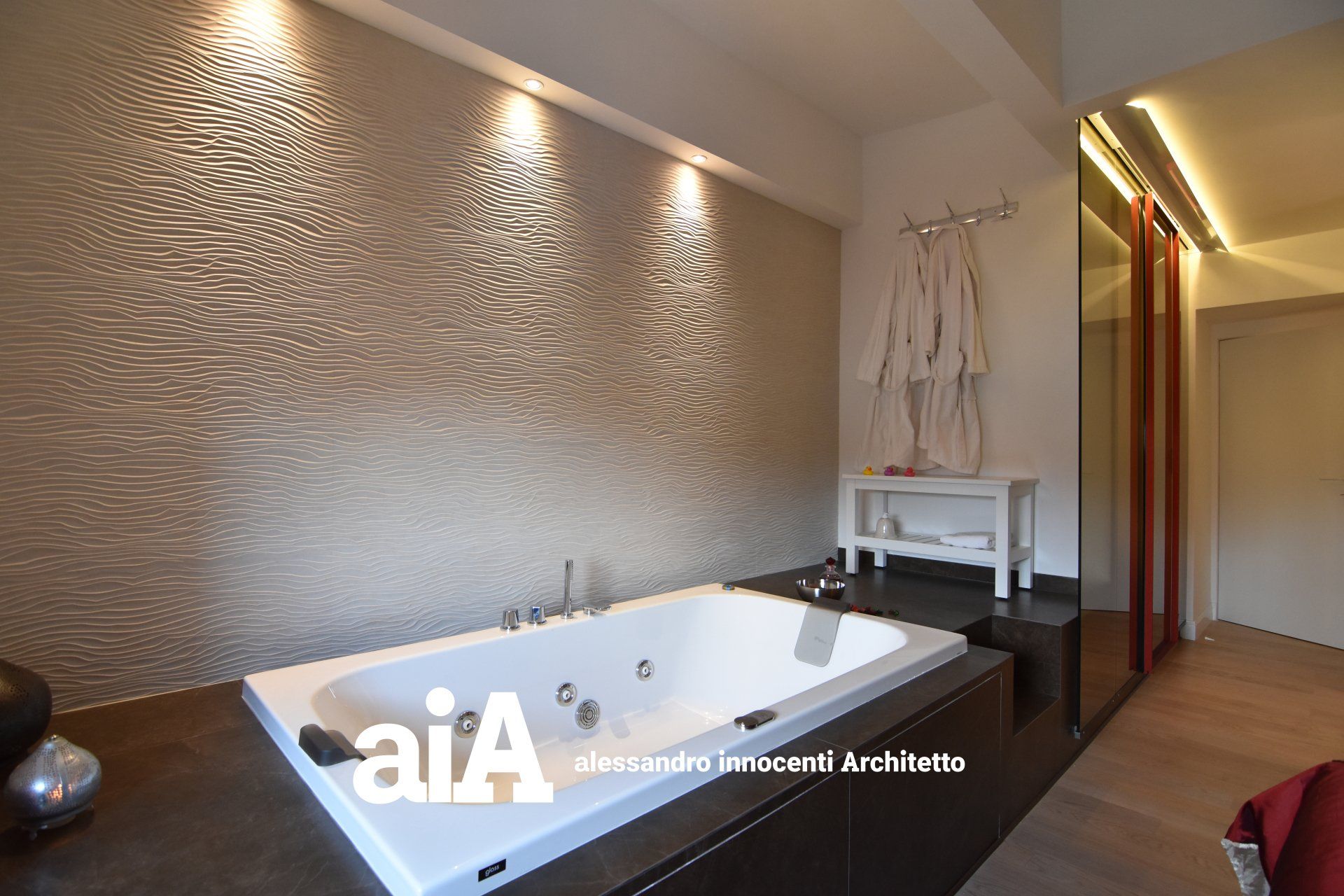 vasca idromassaggio ai piedi del letto e di un ampio vano guardaroba.
