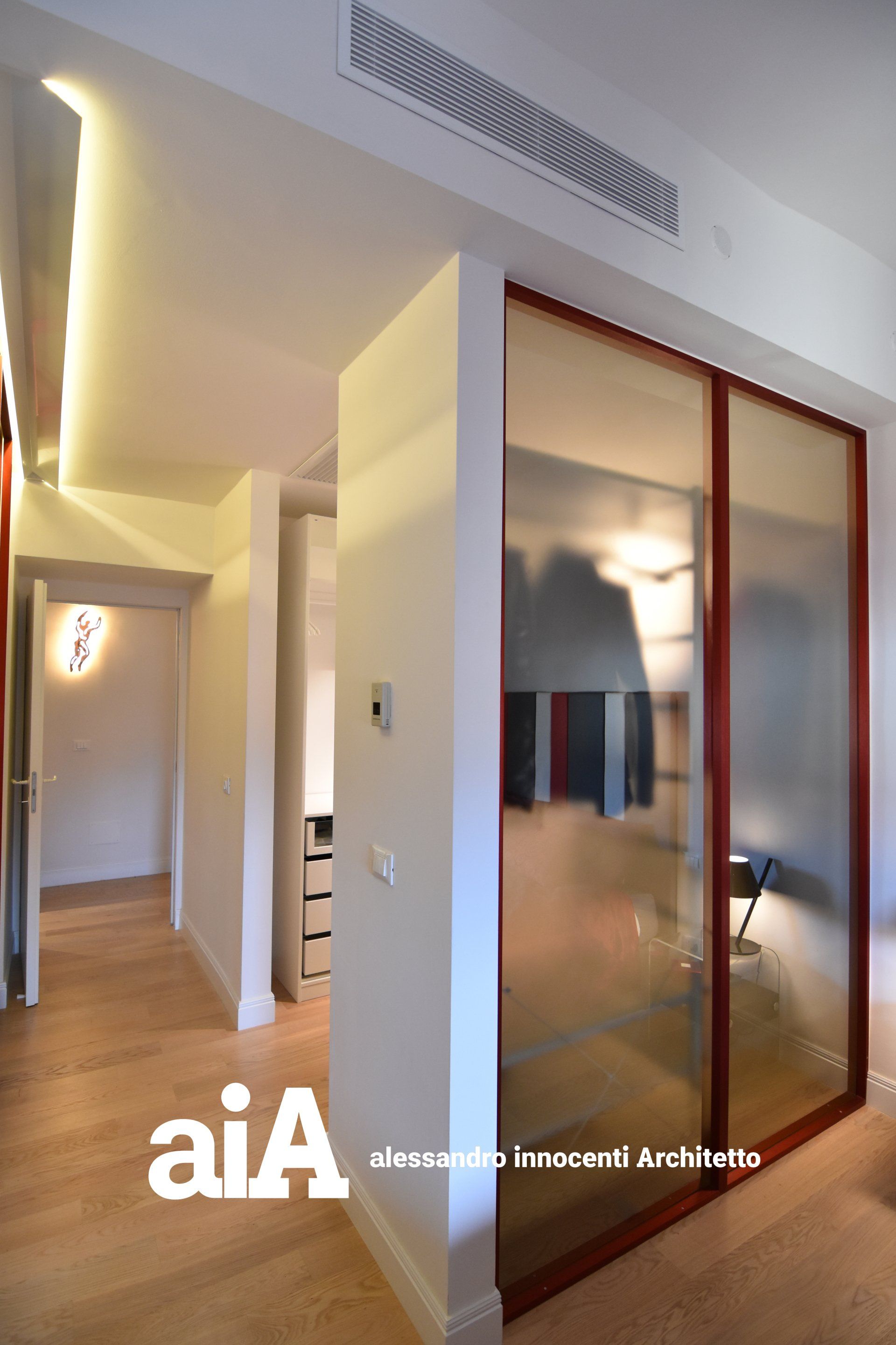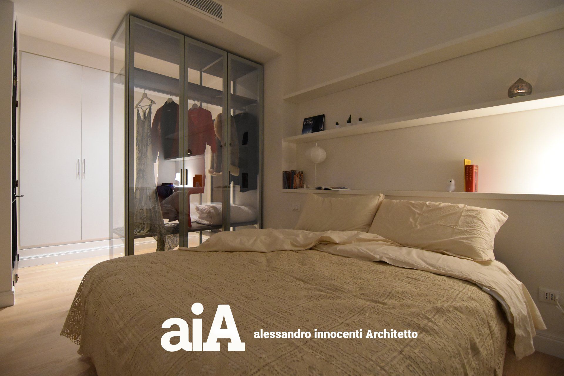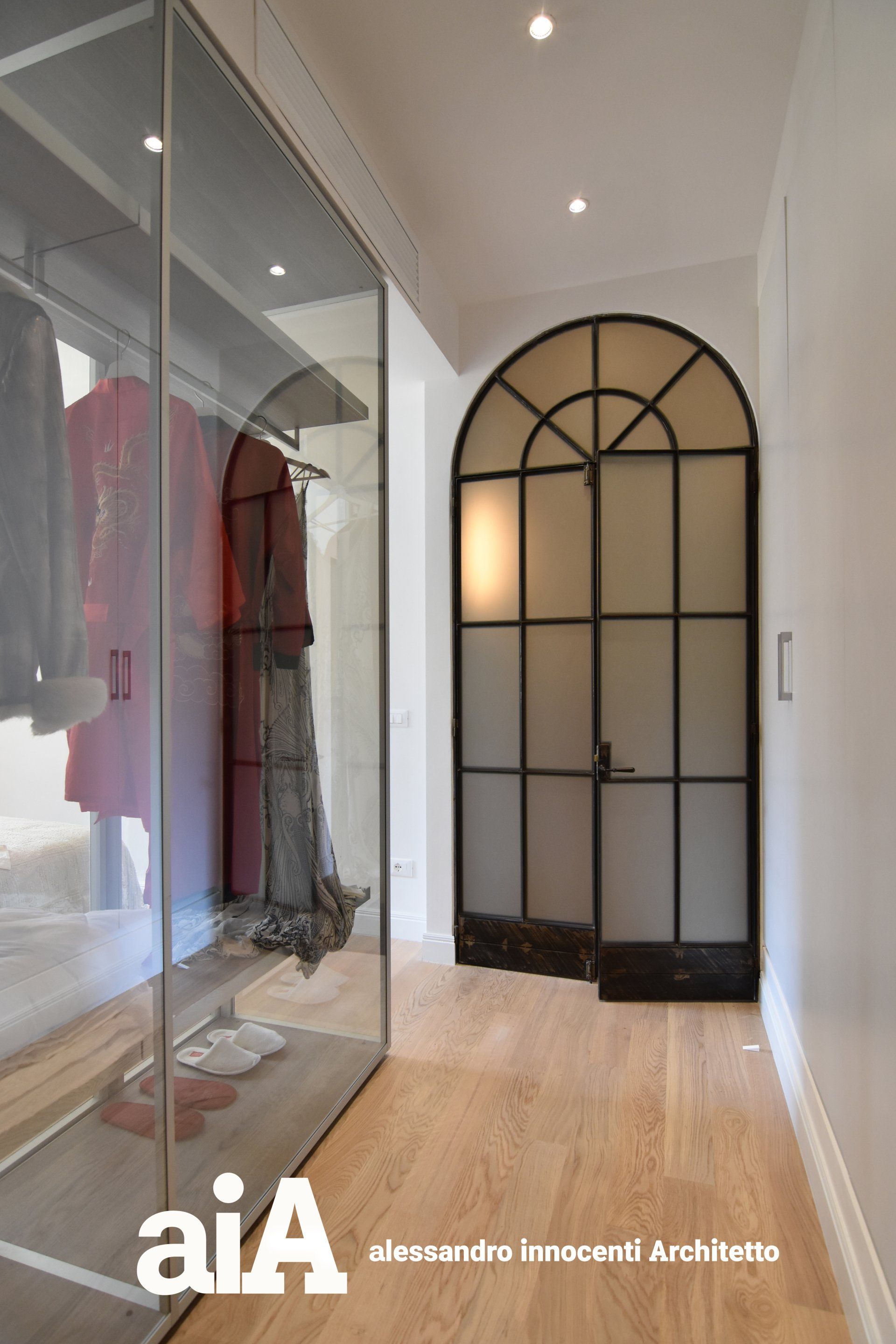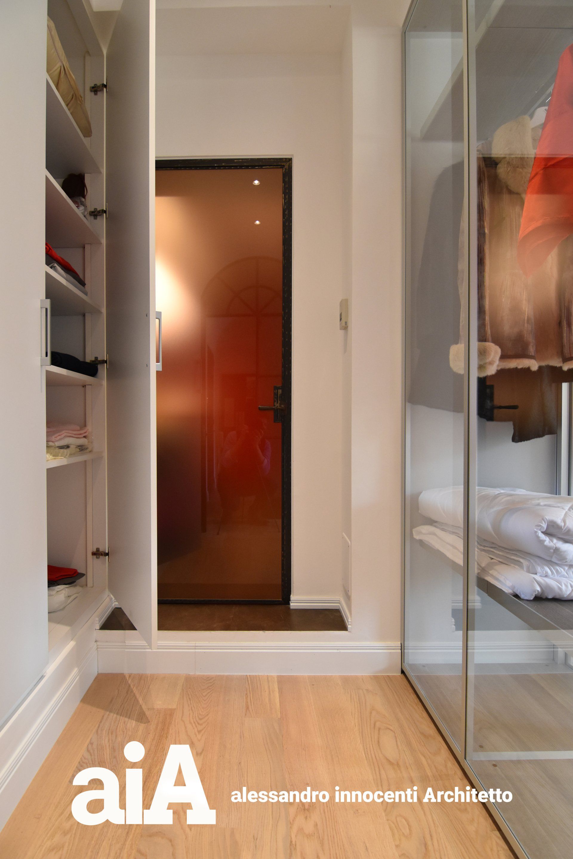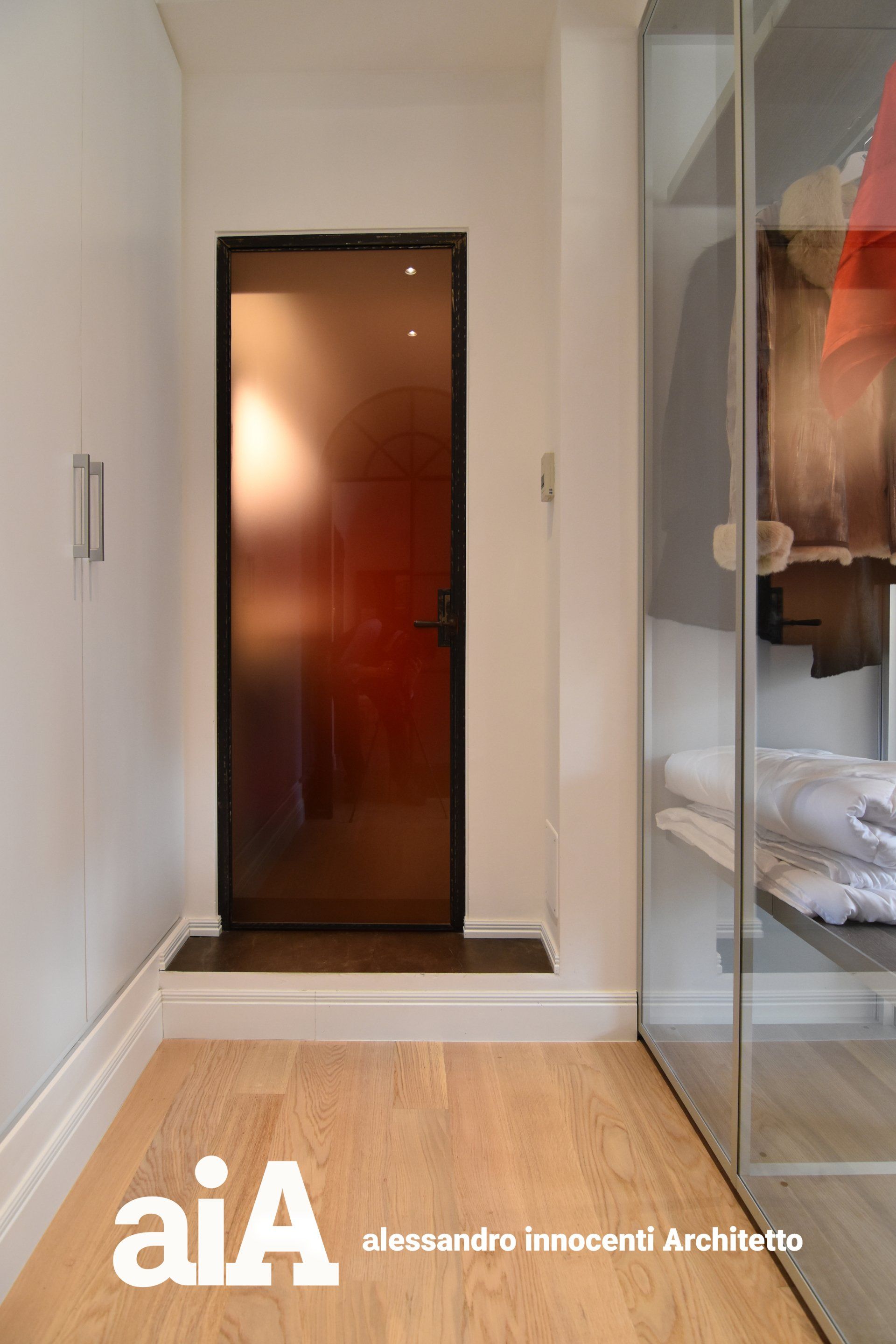 La separazione tra i due ambienti avviene attraverso un armadio in cristallo, che non impedisce alla luce naturale di diffondersi in tutti gli ambienti.