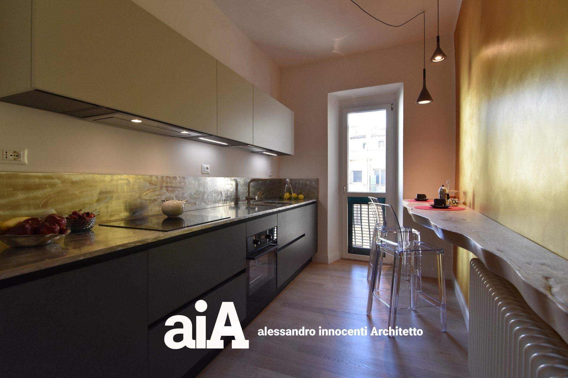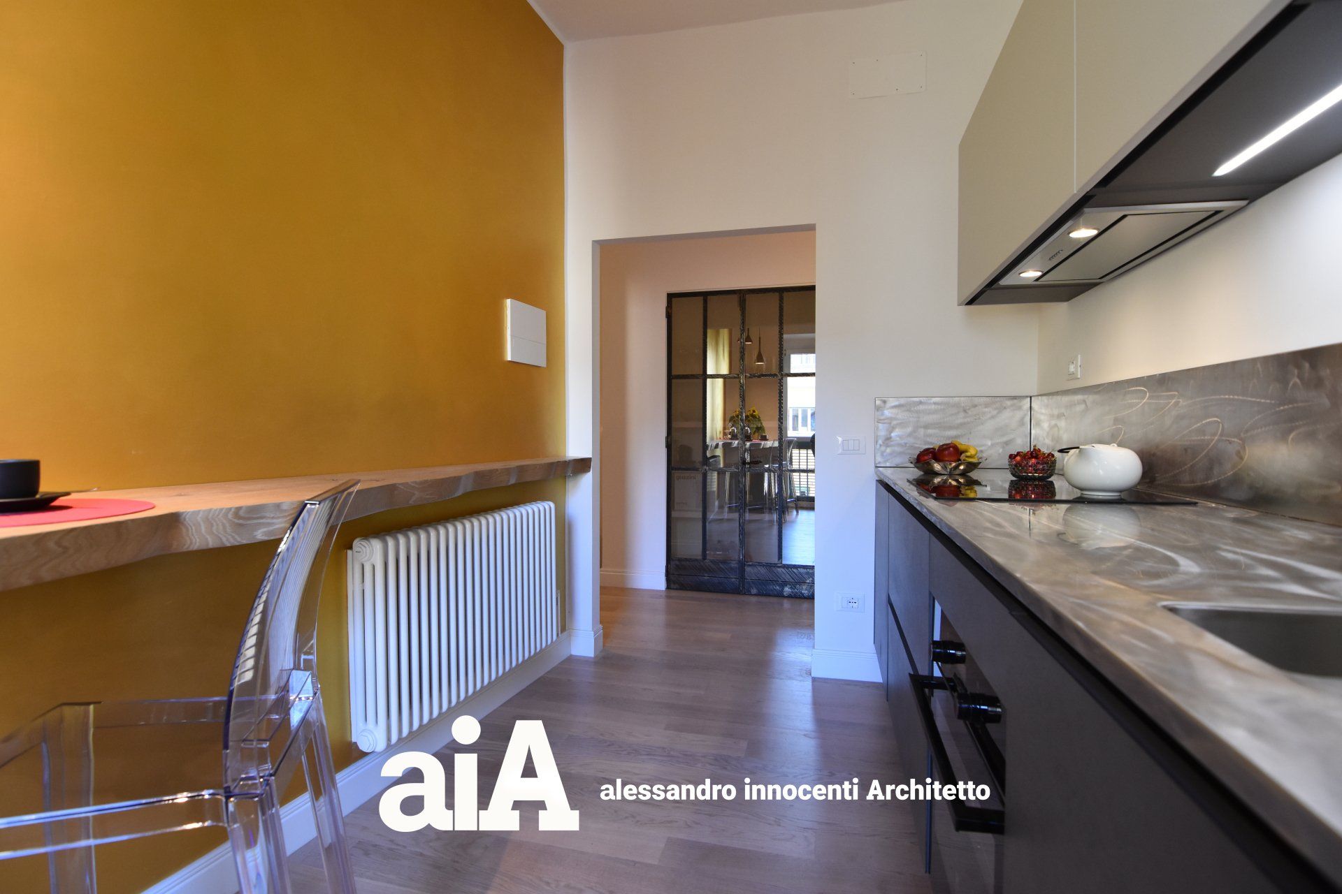 la cucina nella stanza più vicina al soggiorno e dotata della finestra più grande, creando in prossimità dell'ingresso un ambiente filtro, una vera e propria cerniera tra zona giorno e zona notte.