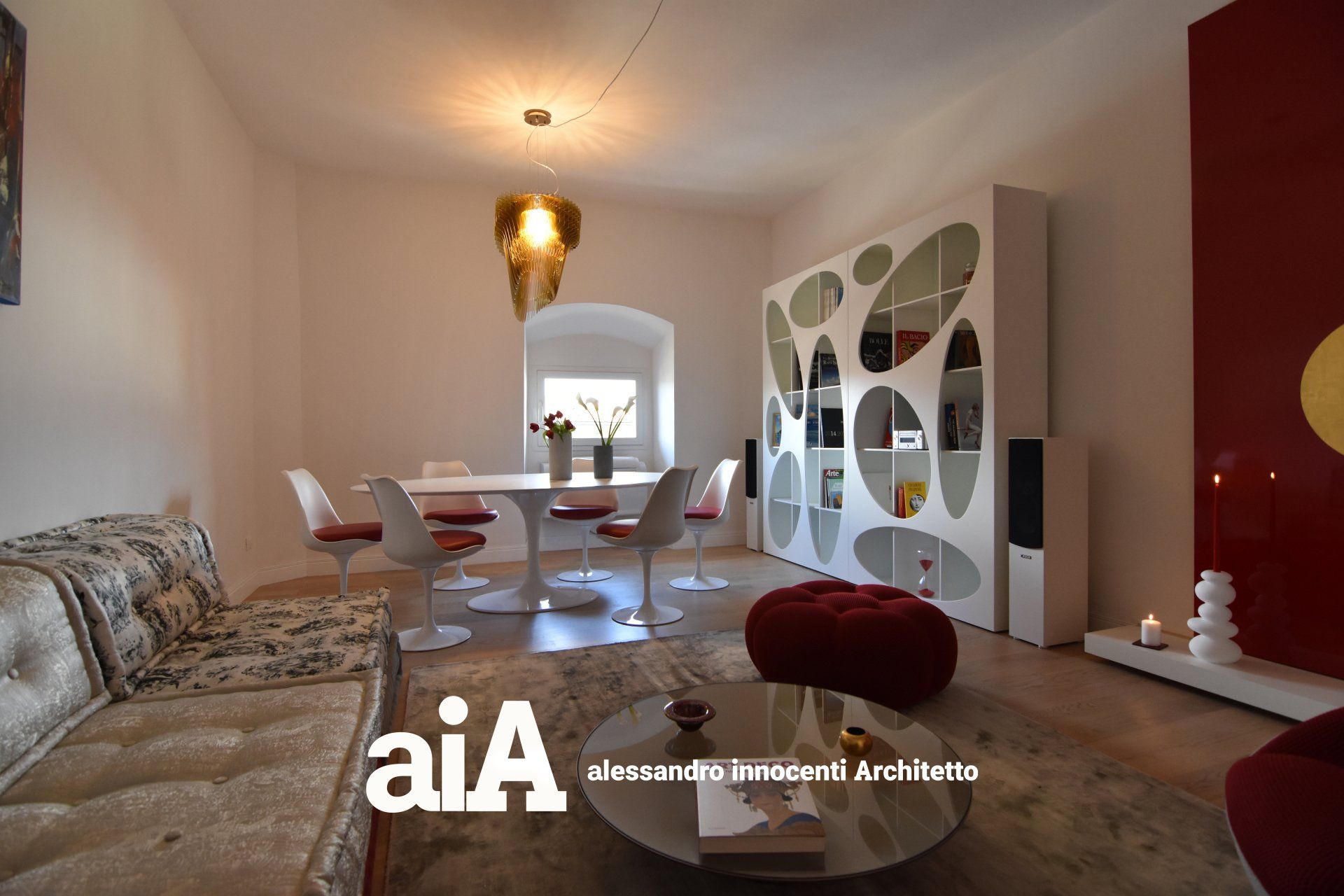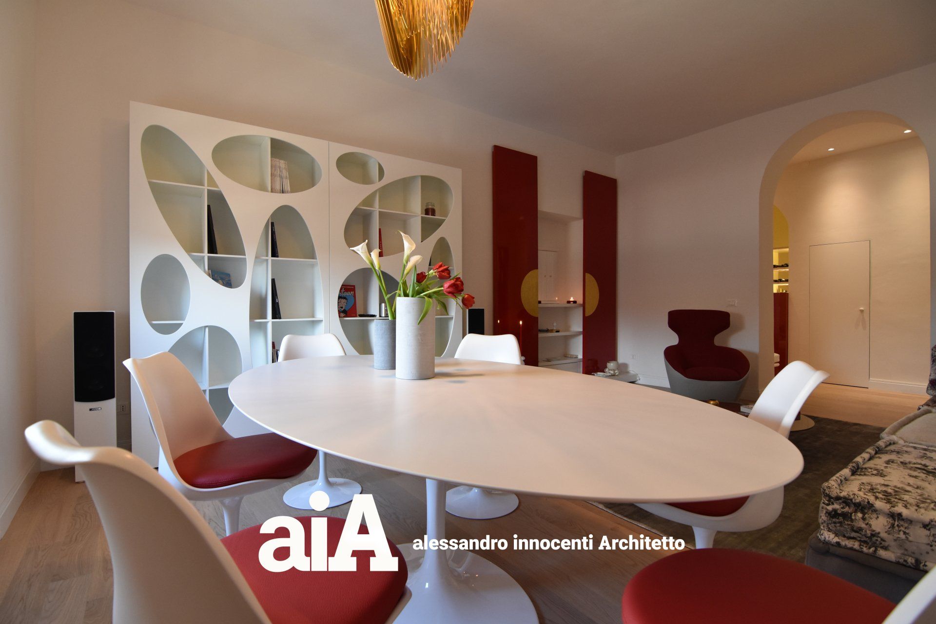A completare la composizione gregari di tutto rispetto: il tavolo Tulip progettato da Eero Saarinen negli anni '40 del '900, Il divano MahJong di Roche Bobois con stoffe disegnate da Jean Paul Gaultier.