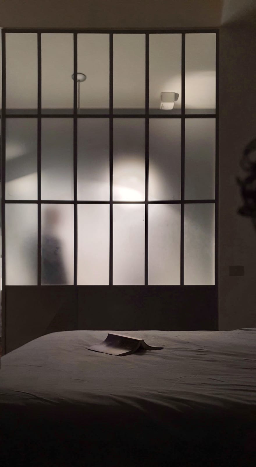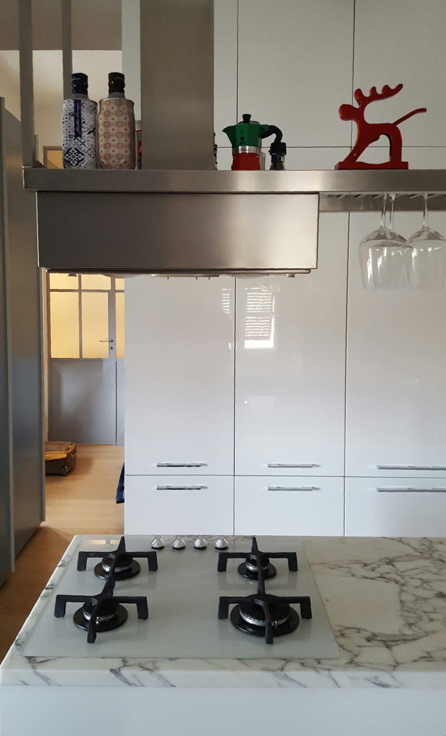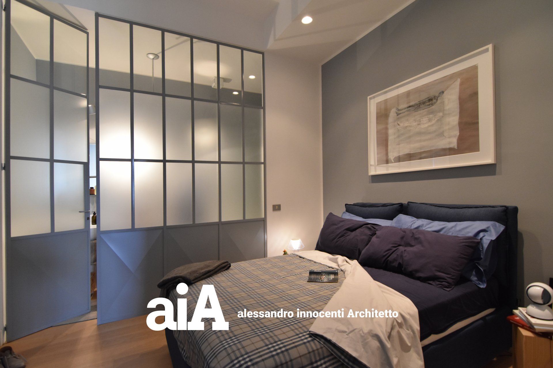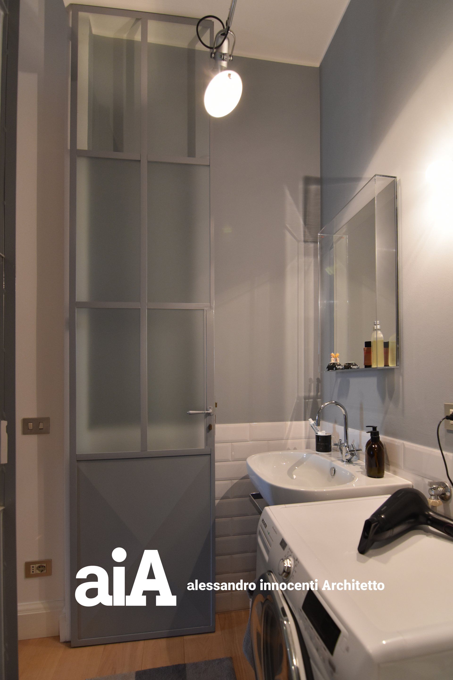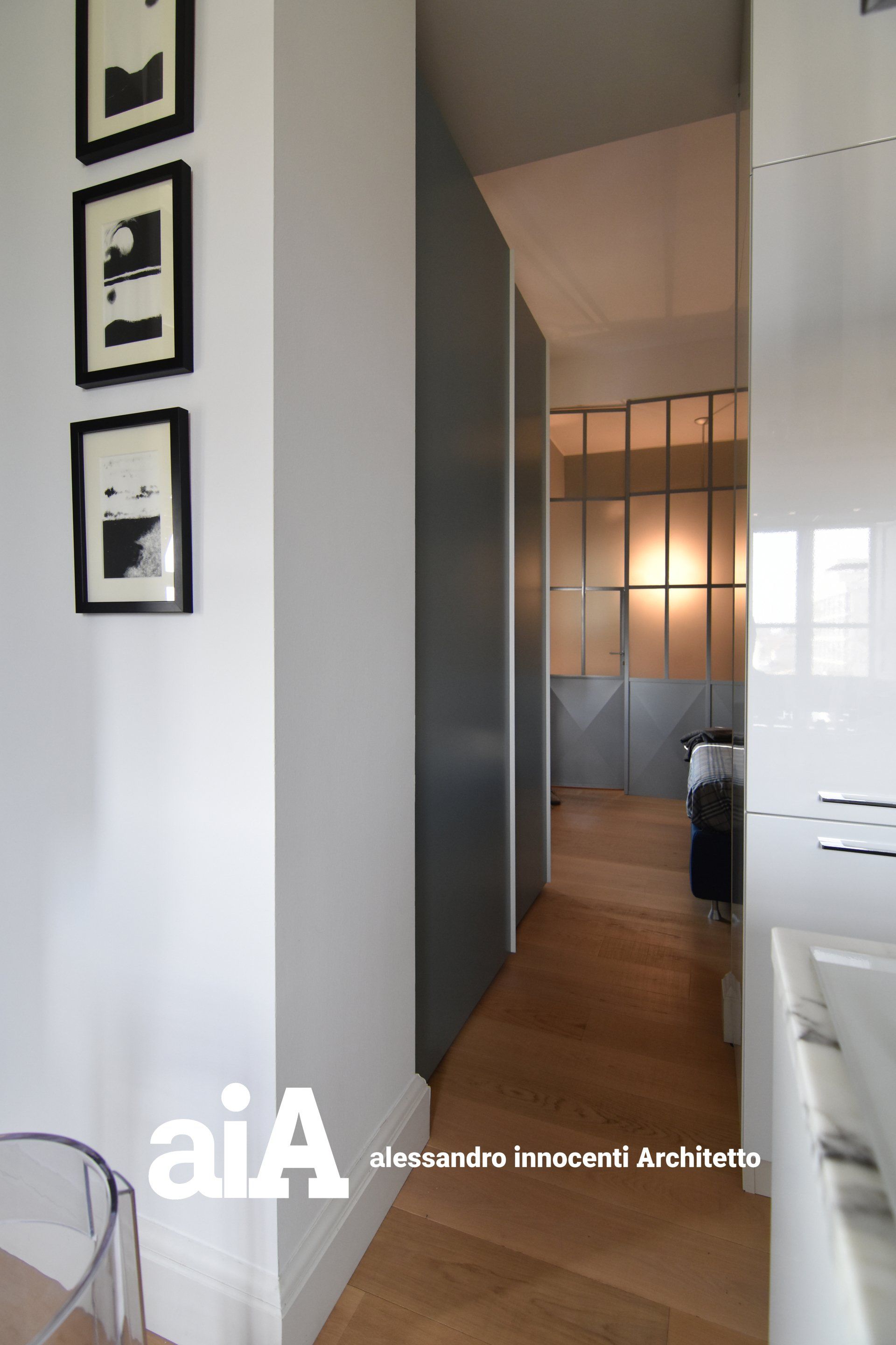 cucina con l'isola centro stanza e la parete divisoria in acciaio e vetro tra camera e bagno sono infatti elementi centrali di una ristrutturazione che feci io stesso sette anni prima.
