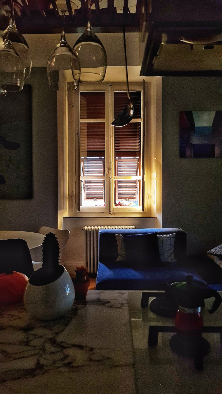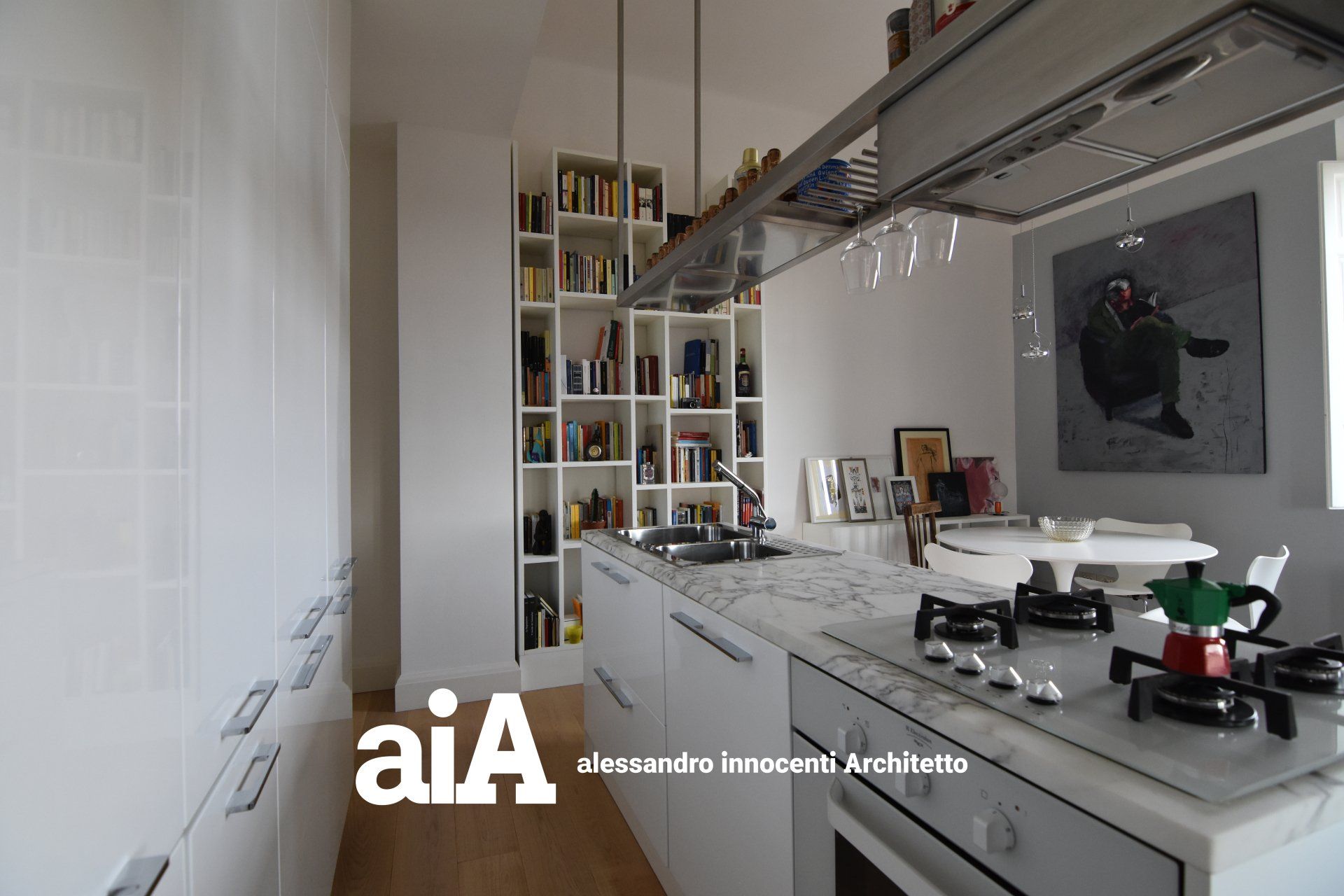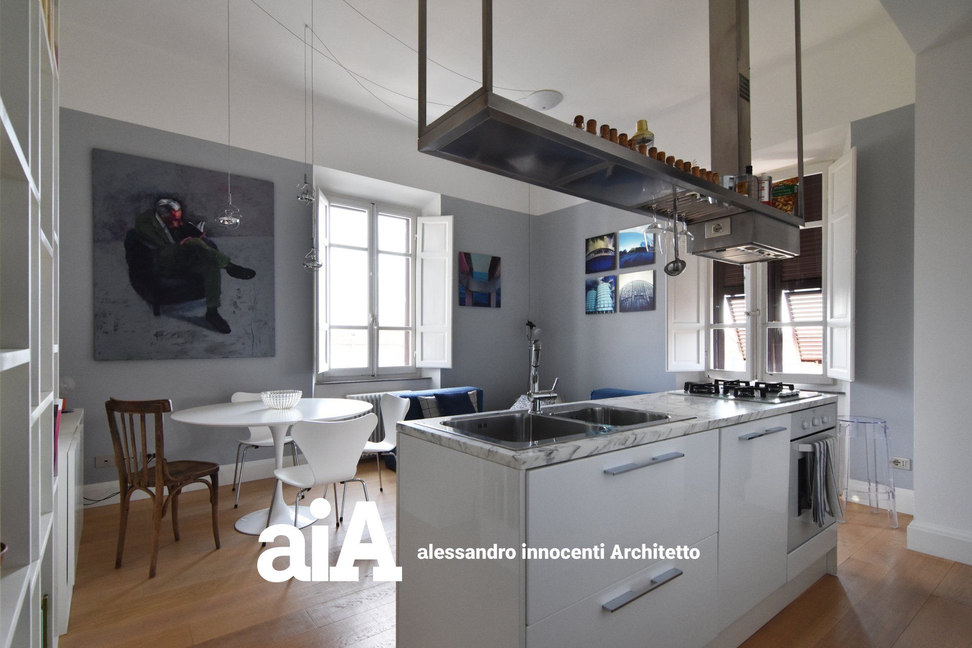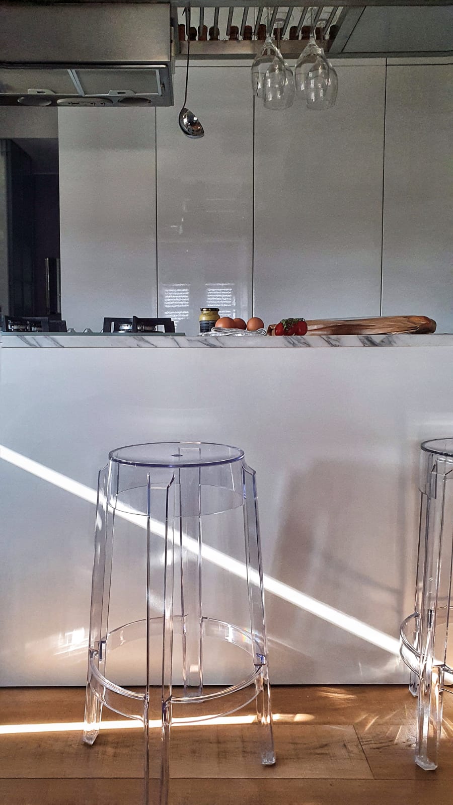 luogo fu studiata una nuova palette cromatica basata su toni freddi da armonizzare alla cucina e alla parete in ferro e vetro esistenti.