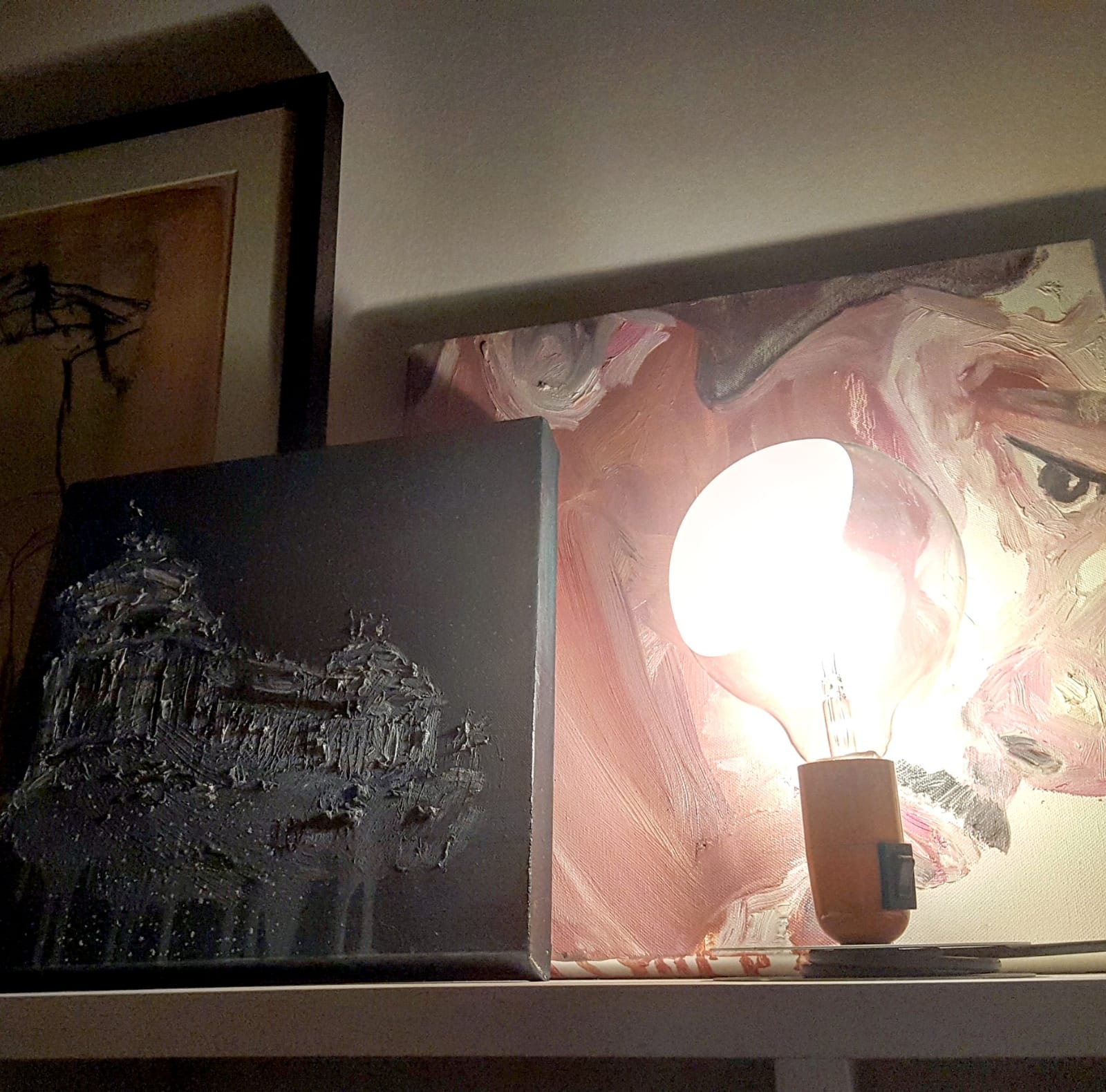 I rettangoli grigi delle pareti diventano lo spazio multimediale dove fluttuano le numerose opere d'arte collezionate dal nuovo proprietario.