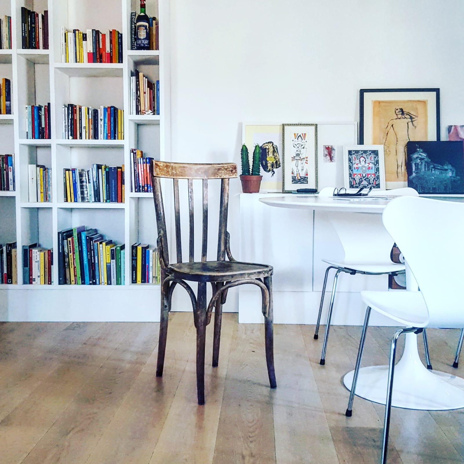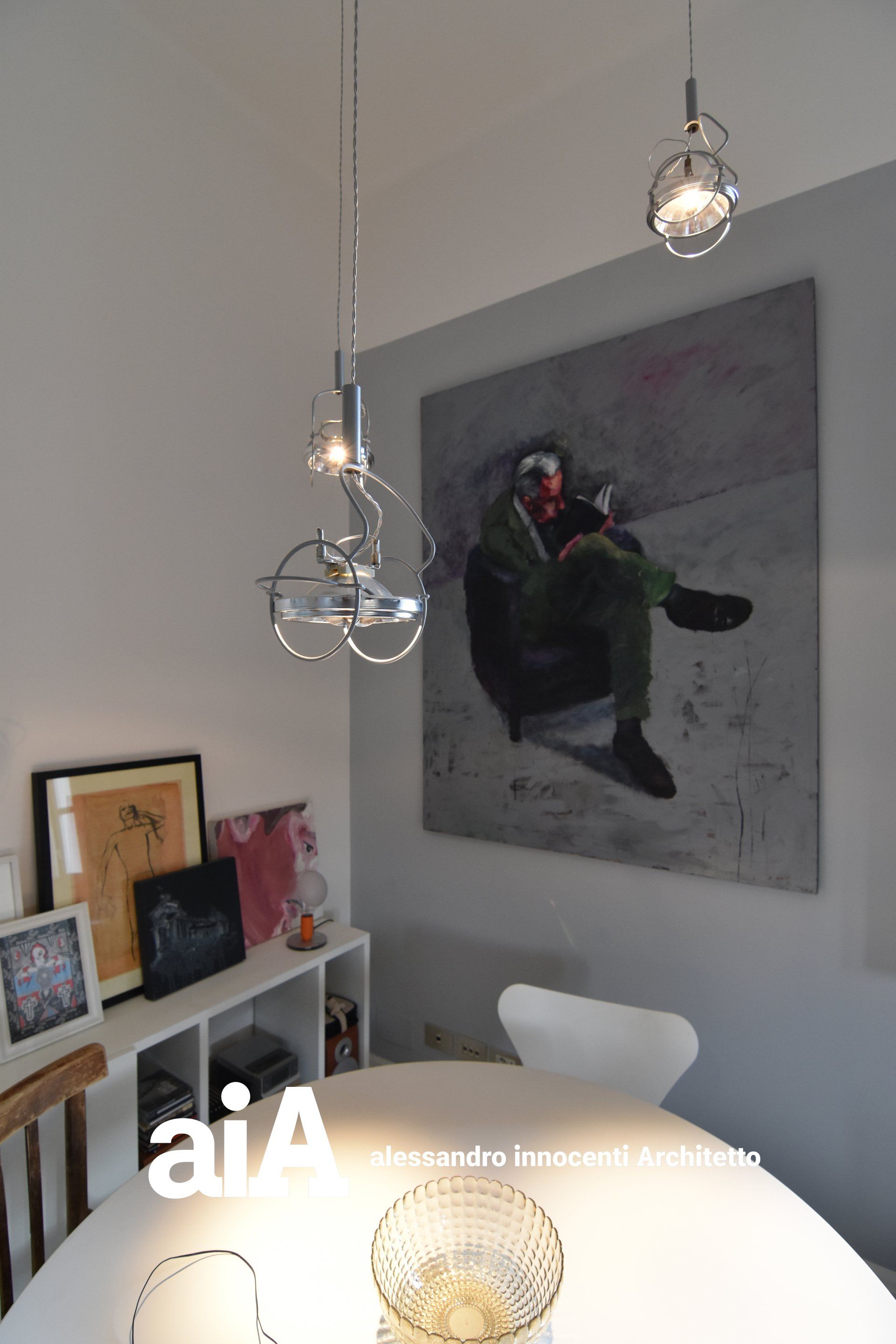 libreria del soggiorno, realizzata su misura in legno laccato bianco su mio progetto, i due tavoli della serie Tulip progettati da Eero Saarinen; le sedie disegnate da Arne Jacobsen nel 1955 che si alternano a sedie liberty di inizio '900; il lampadario composito della serie ALBUM sopra il tavolo da pranzo e una selezione di lampade, icone del '900, prodotte da Flos, Kartell e Artemide.