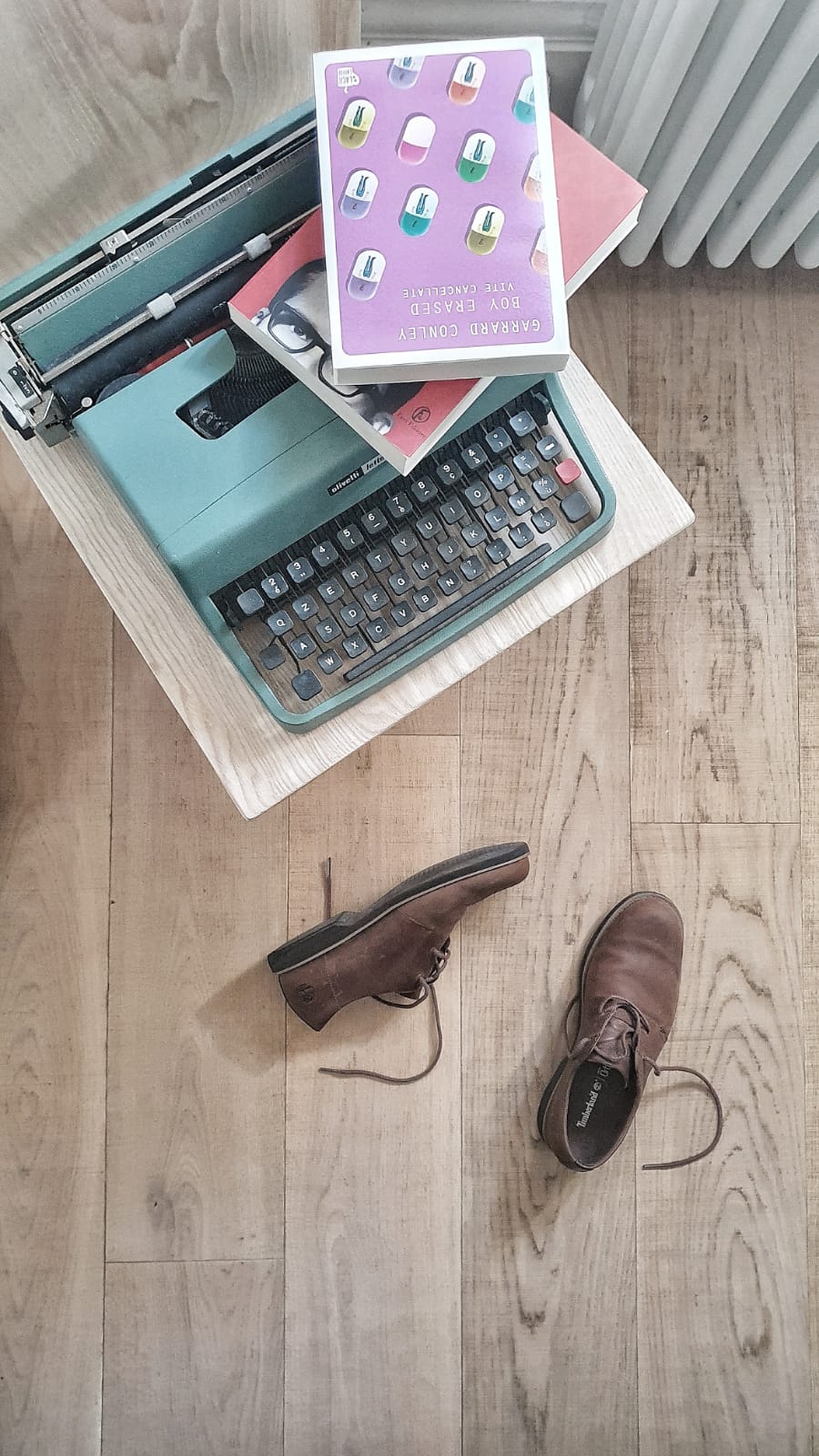 bianco, il grigio, l'azzurro e il marrone del pavimento: un listone segato a mano in rovere di straordinaria matericità e bellezza.